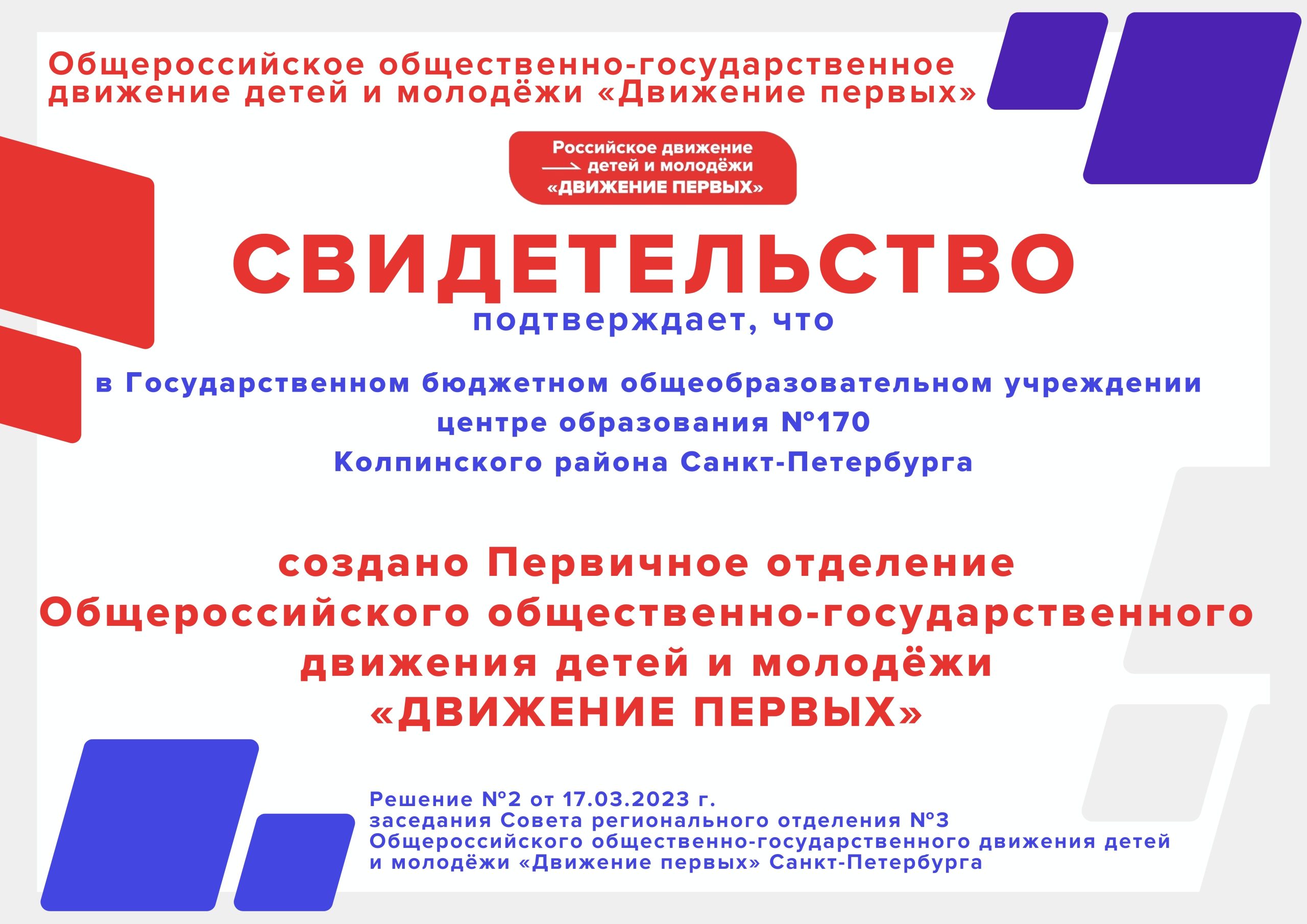 Первичное отделение Российского движения детей и молодёжи «Движения Первых» Государственного бюджетного общеобразовательного учреждения центра образования №170 Колпинского района Санкт-Петербурга
