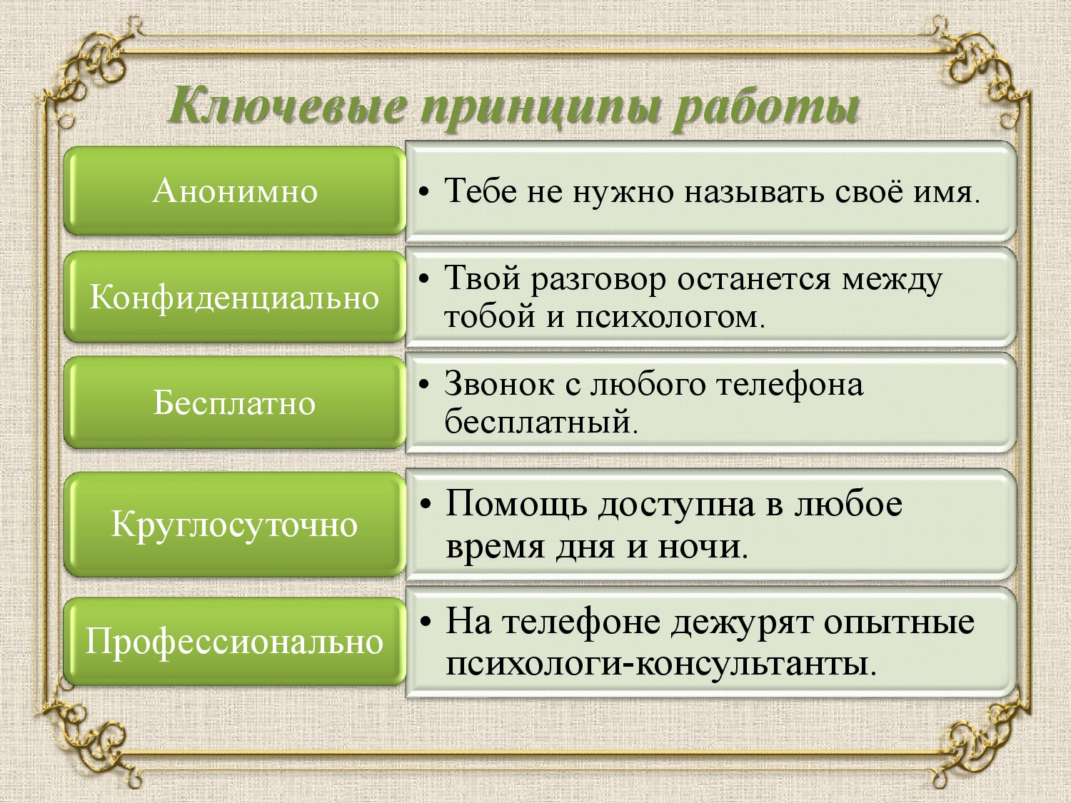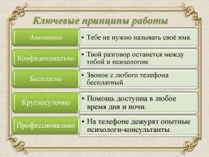 • Основные принципы: Звонок абсолютно бесплатный, анонимный и конфиденциальный.