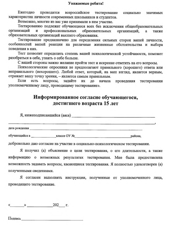 Тестирование является добровольным. Для учащихся до 15 лет требуется информированное согласие от родителей (законных представителей). Учащиеся с 15 лет самостоятельно дают согласие на прохождение тестирования. |