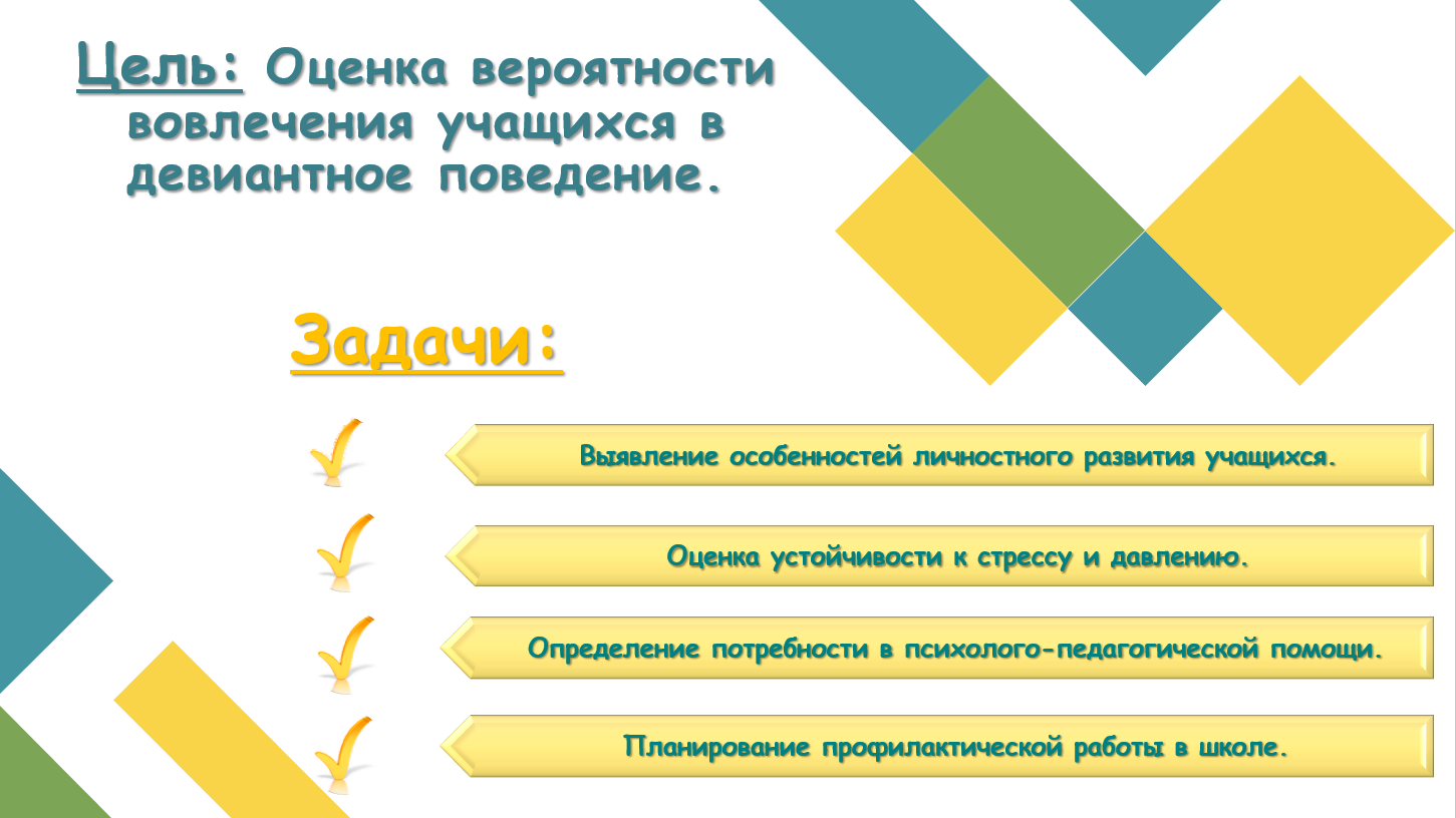 | Что будет после тестирования? | На основании результатов школа планирует профилактическую работу: тренинги, классные часы, индивидуальные консультации психолога. Для учащихся, показавших высокий уровень риска, будет организовано индивидуальное сопровождение. |